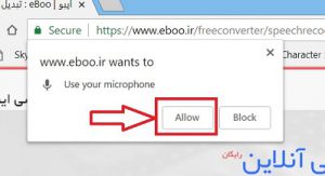 برای فعالسازی میکروفون در مرورگر گوگل کروم بعد از کلیک بر روی دکمه میکروفون مانند تصویر زیر بر روی دکمه Allow کلیک کنید: